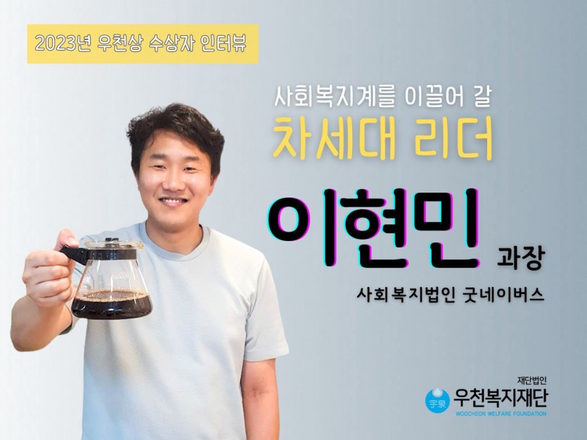 안녕하세요 사회복지법인 굿네이버스에서 일하고 있는 이현민입니다. 우선 귀중한 상을 주신 우천복지재단에 깊은 감사를 드립니다. 제가 이미 차세대 리더라서 주신 것이 아닌, 앞으로 그렇게 되라고 주신 것이라 생각하고 있습니다. 다른 명예로운 상들도 있지만, 제게는 큰 동기부여가 되는 상이라서 더욱 감사하고 있습니다. 주변에서도 상금이 있는 상이라 더욱 부러워하더라고요. (웃음)