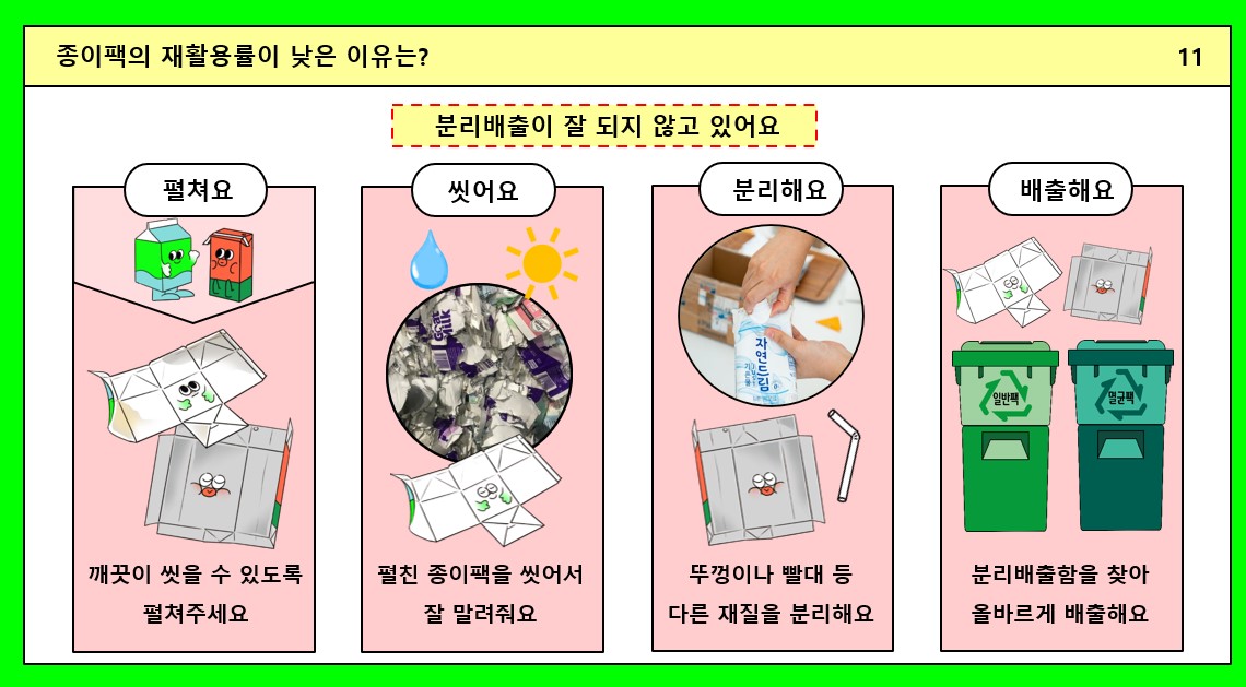 이번 교육에서 가장 기억에 남는 건 바로 종이팩 분리배출 3단계, "펼.씻.분.배"이었어요.